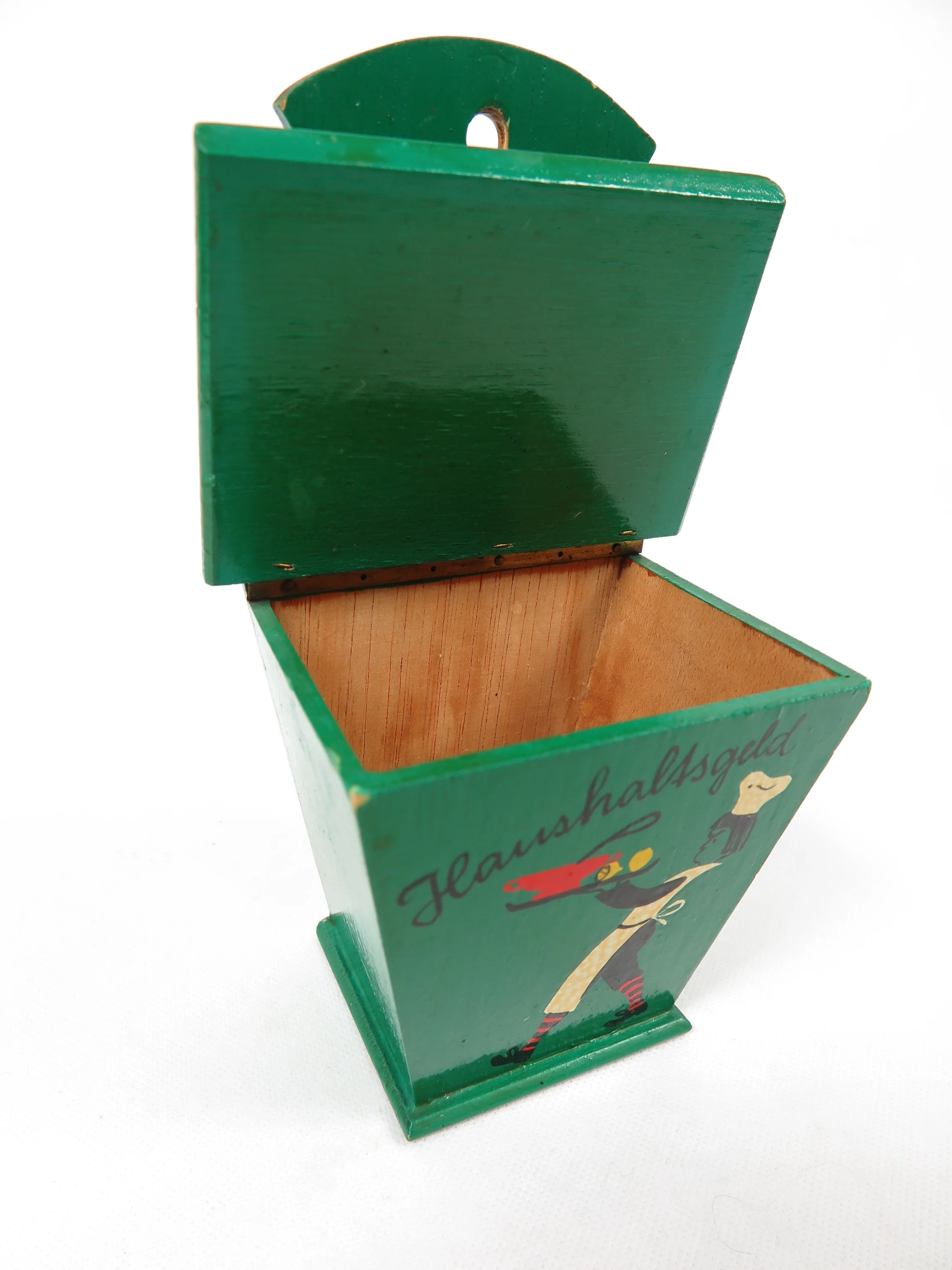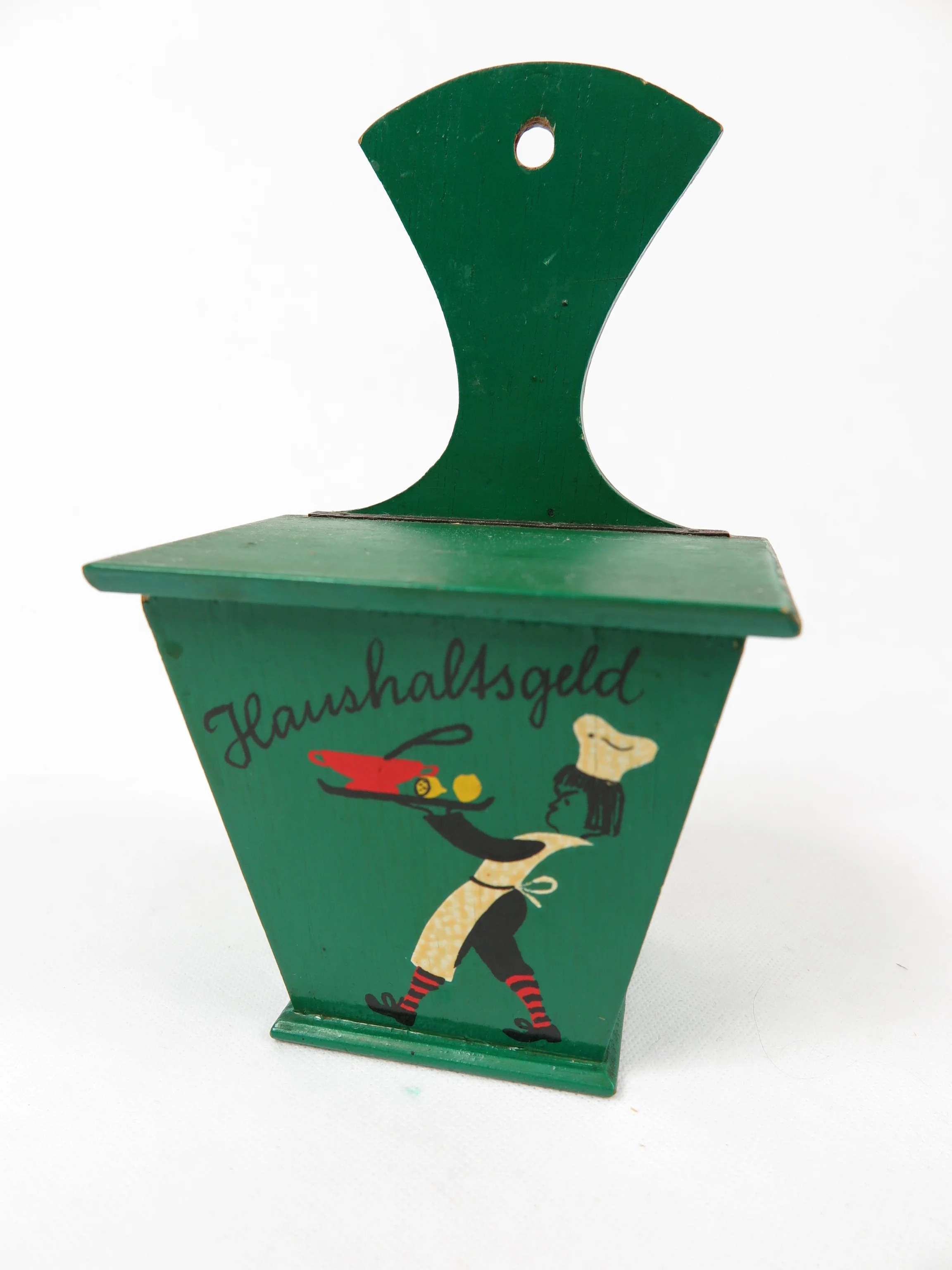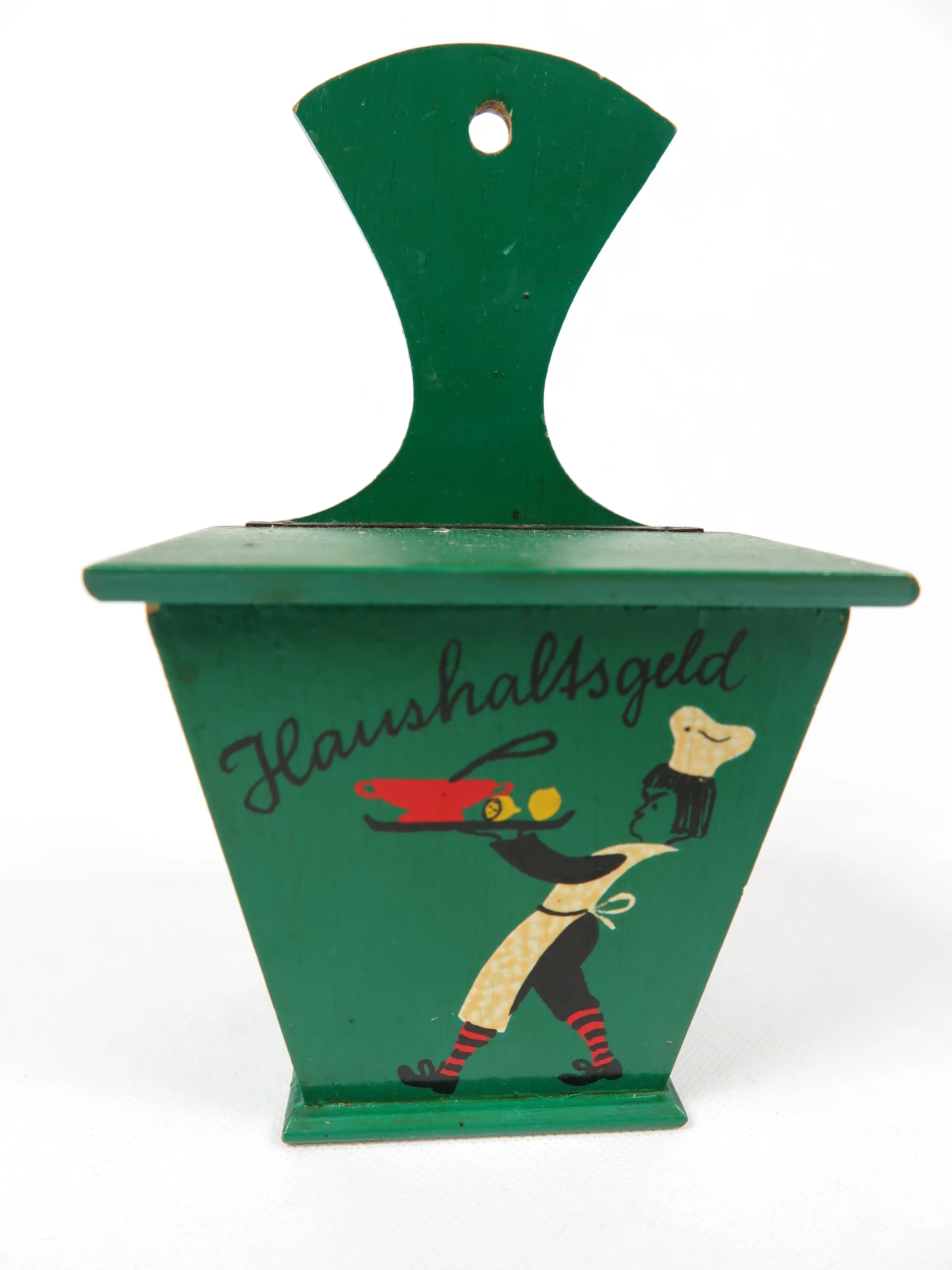 合板の箱は緑色に塗られ、"Haushaltsgeld"(家計費)の文字と給仕のコックがきれいに描かれている。